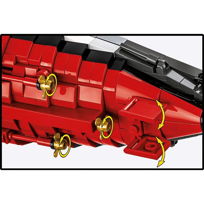 - Viele bewegliche Teile: Dreh- und schwenkbare Geschütztürme, bewegliche Schiffsschrauben, Segmente des Antriebsstrangs zum Herausnehmen und ein abnehmbarer Deckabschnitt erlauben einen Einblick ins liebevoll gestaltete Innere des Modells.